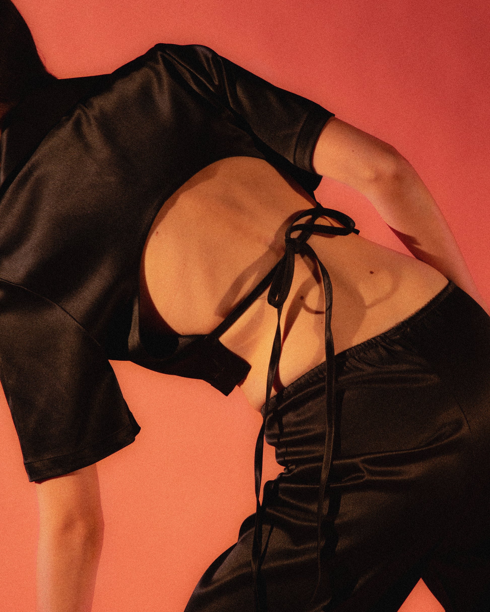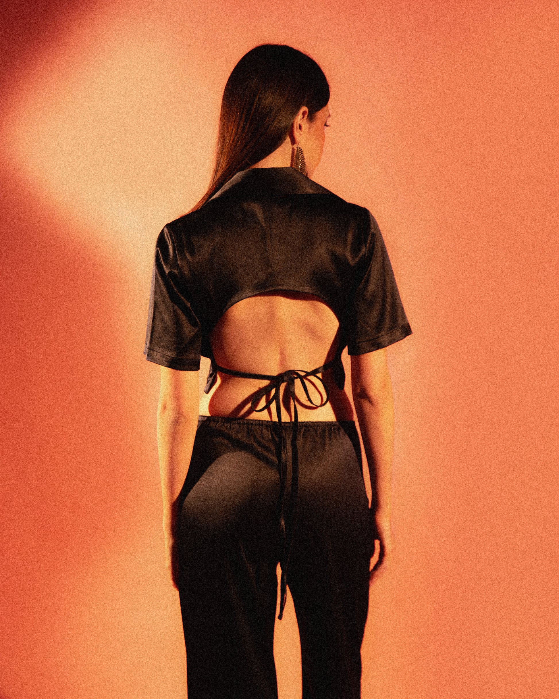 The Satin Backless Camp Shirt pairs a clean button-down front with an open back, finished with delicate adjustable ties for a custom fit. Crafted from a glossy, fluid satin, it offers a balance of structure and softness. Designed to sit cropped at the waist, it styles effortlessly with wide-leg pants, denim, or evening trousers.